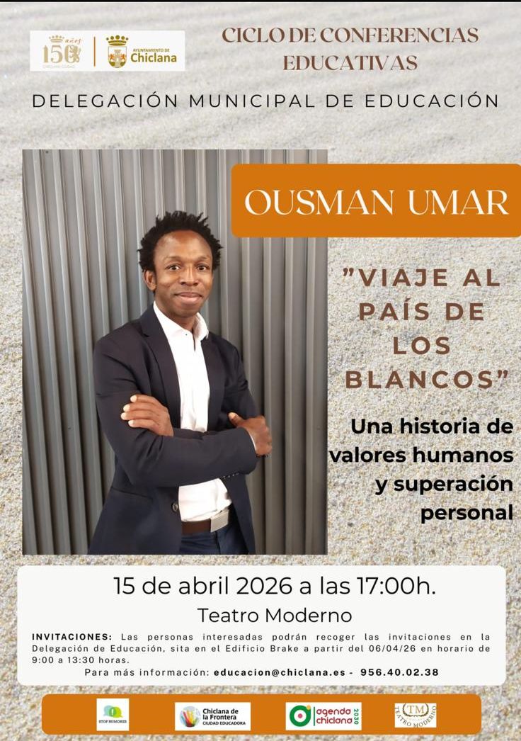 El Ayuntamiento de Chiclana, a través de la Delegación Municipal de Educación, ha organizado una conferencia que correrá a cargo de Ousman Umar, joven de Ghana que, tras un duro viaje cruzando varios países y el desierto del Sáhara, llegó a Barcelona, donde fue acogido por una familia. Este encuentro está incluido dentro del Programa de Conferencias Educativas y se celebrará mañana miércoles en el Teatro Moderno, a partir de las 17.00 horas.