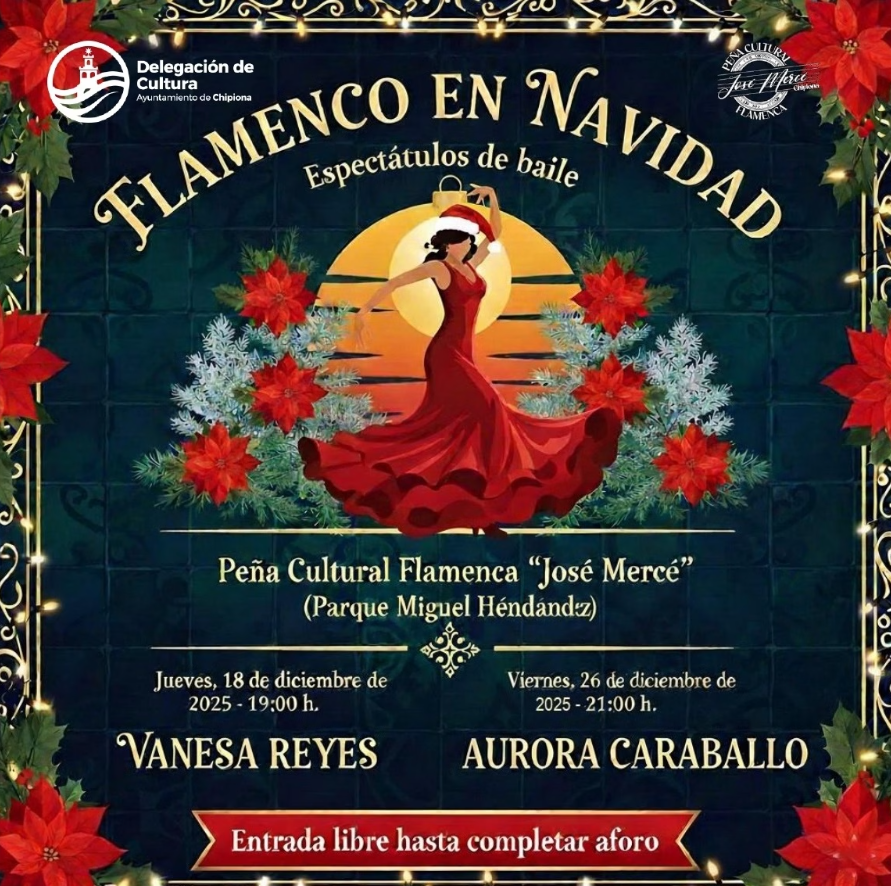 El jueves 18 de diciembre a las 19:00 h. actuará la bailaora local Vanesa Reyes y el viernes 26 de diciembre a las 21:00 h. lo hará la también bailaora chipionera Aurora Caraballo.
