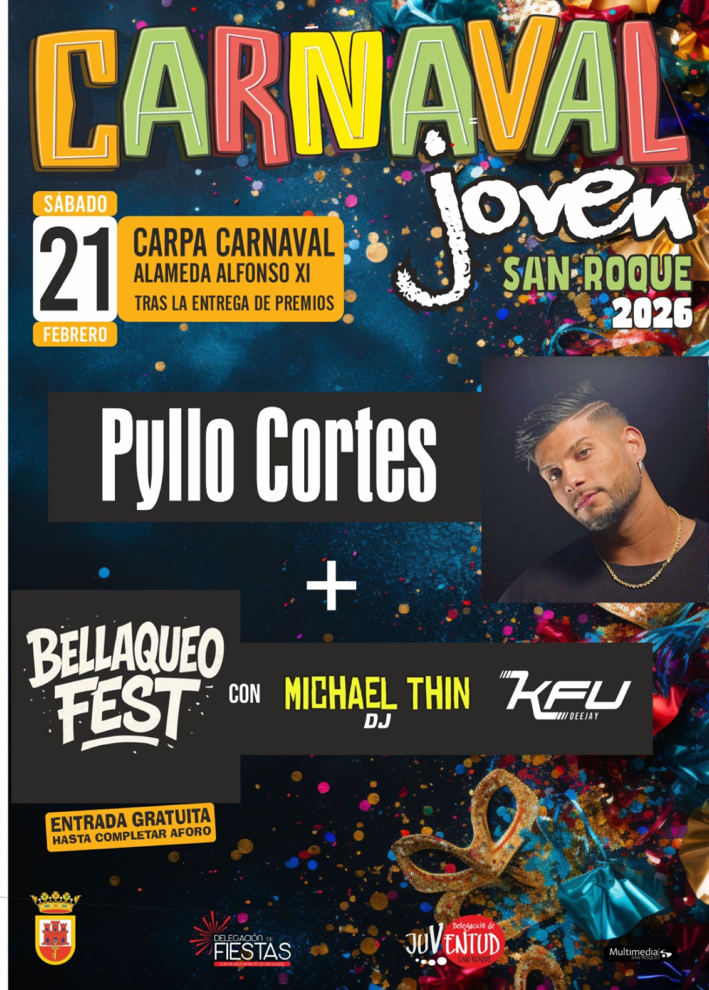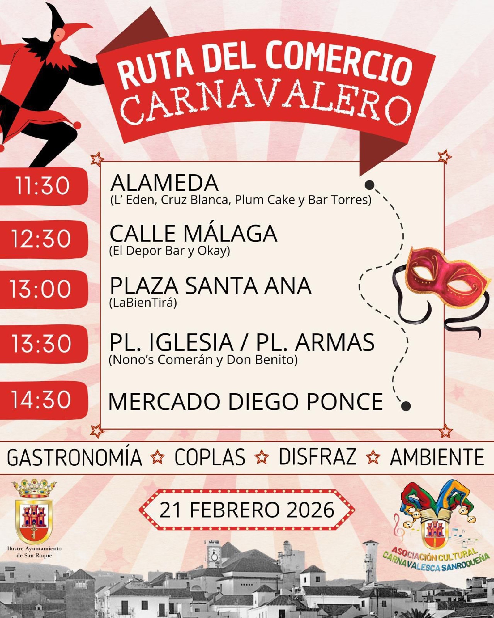 I Ruta de Comercio Carnavalero, en la que habrá una fiesta infantil en el Mercado Diego Ponce y también participarán nueve bares del Casco. En la noche del sábado, tras la entrega de premios del concurso de disfraces de San Roque Ciudad, en la carpa de la Alameda Alfonso XI, se celebrará una fiesta dirigida principalmente al público juvenil con la actuación de Pyllo Cortés y el Bellaqueo Fest a cargo de varios Djs.
