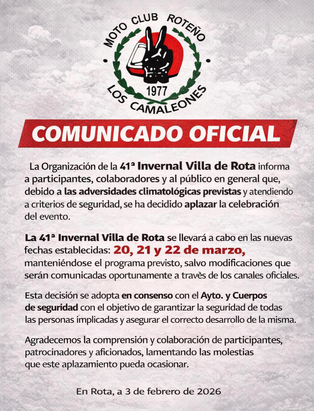 La decisión ha sido consensuada en el marco de la reunión mantenida entre el Ayuntamiento de Rota, la Policía Local, el Moto Club Roteño "Los Camaleones" y otros cuerpos de seguridad, en la que se ha priorizado la seguridad de participantes, trabajadores, visitantes y vecinos. Asimismo, se ha tenido en cuenta la complicada situación que la lluvia persistente y el viento están generando en las carreteras, tanto del municipio como de otras comarcas, lo que incrementa los riesgos asociados a los desplazamientos.