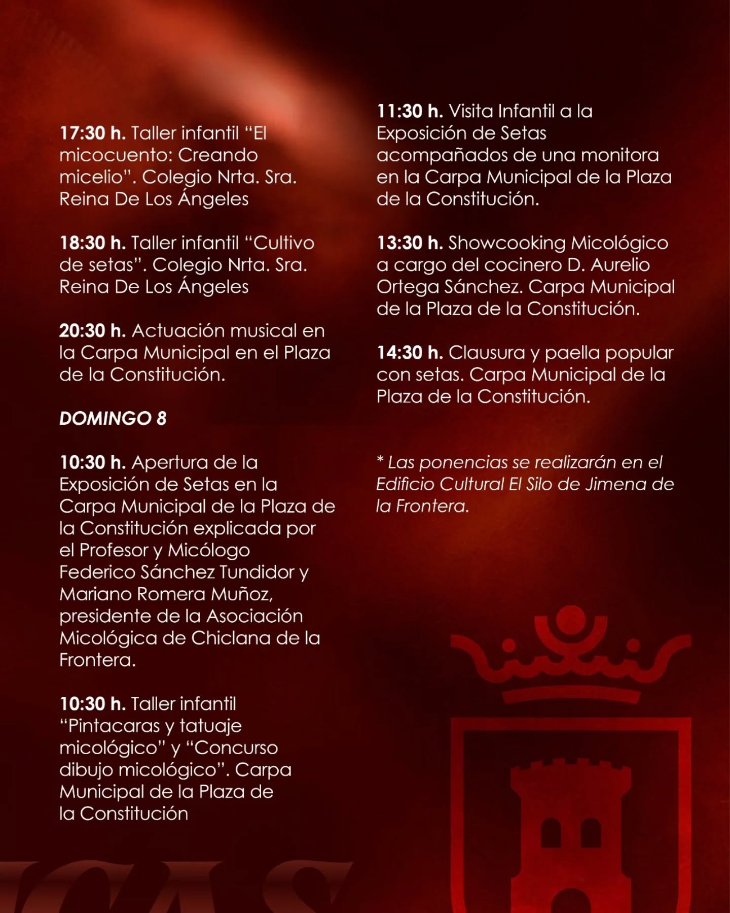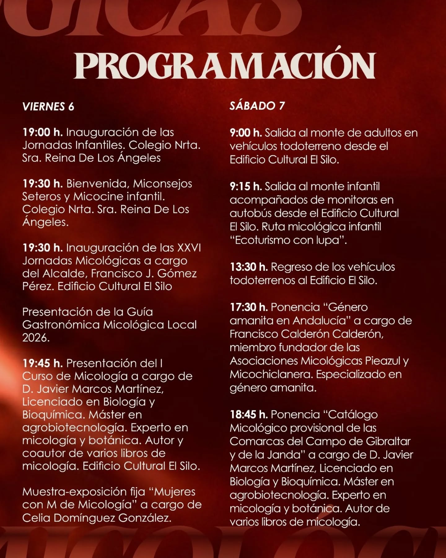Con una extensa programación en la que disfrutaremos de ponencias a cargo de Javier Marcos y Francisco Calderón, una exposición sobre la mujer en la micología presentada por Celia Domínguez, una salida al campo para poder observar directamente las más de 100 especies de setas del Parque de los Alcornocales. Y cerraremos las Jornadas con una exposición y un showcooking en el que aprender y degustar varios platos con setas.