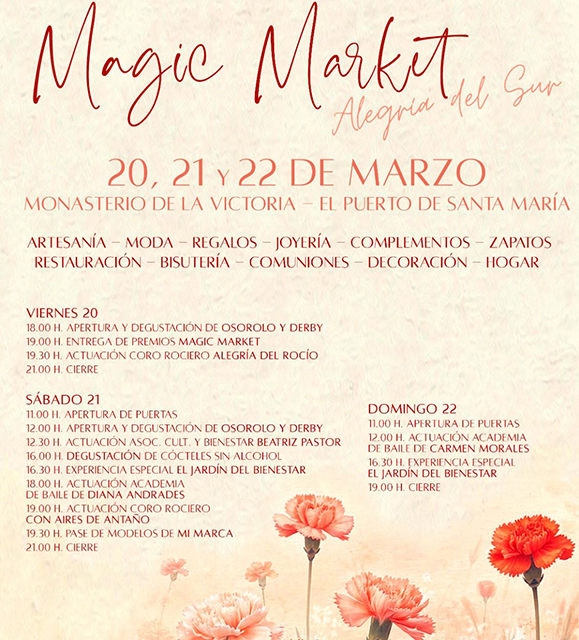 El programa contempla el viernes 20 a las 19:00 horas la entrega de los premios Magic Market y, a las 19:30 horas, la actuación del coro rociero Alegría del Rocío. El sábado 21 se celebrará a las 12:00 horas la apertura y degustación de Osorolo y Derby, a las 12:30 una actividad de la Asociación Cultural y Bienestar Beatriz Pastor, a las 16:00 una degustación de cócteles sin alcohol y a las 16:30 la experiencia especial “El jardín del bienestar”. La jornada continuará con la actuación de la Academia de Baile de Diana Andrades a las 18:00 horas, la actuación del coro rociero Con Aires de Antaño a las 19:00 horas y, a las 19:30 horas, un pase de modelos de Mi Marca.