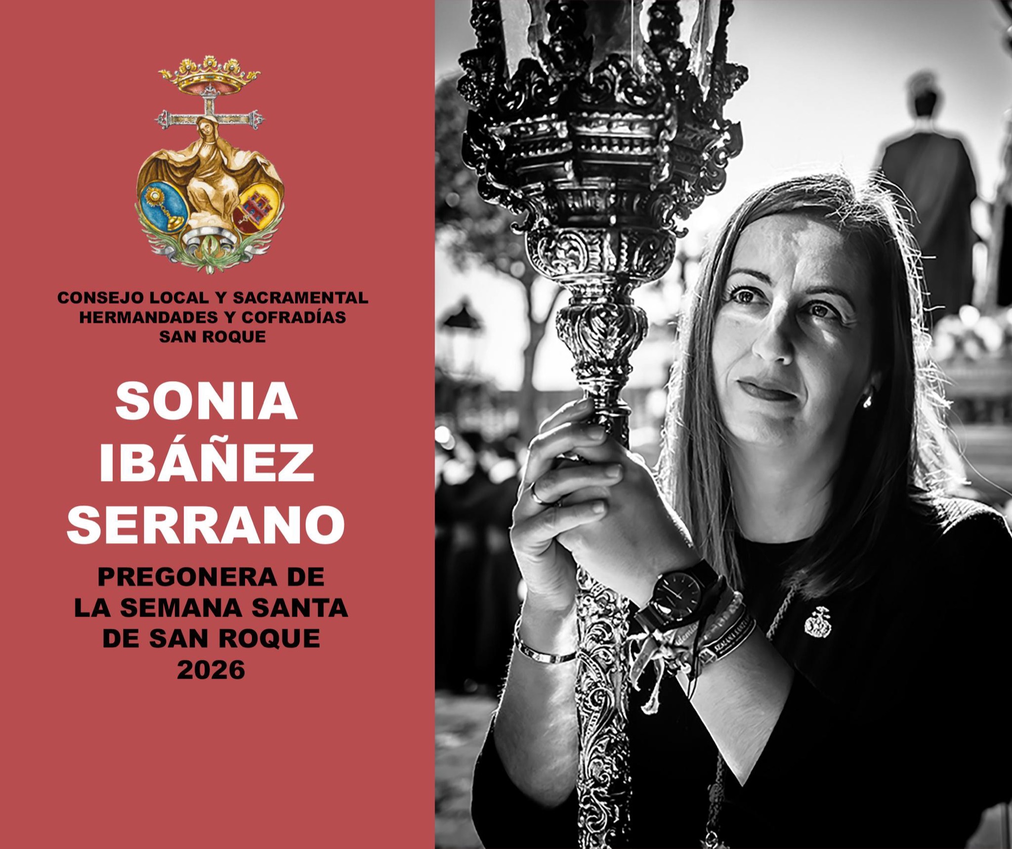 El Consejo Local de Hermandades y Cofradías de San Roque designó el pasado mes de noviembre a Sonia Ibáñez Serrano como la encargada del Pregón de la Semana Santa 2026, que se desarrollará este sábado en el Teatro Juan Luis Galiardo. Colabora el Ayuntamiento de San Roque, a través de la Delegación de Tradiciones, que dirige la teniente de alcalde María del Mar Collado. La edil felicitó al Consejo por la acertada designación de Sonia Ibáñez como pregonera, una persona tan vinculada a la Semana Santa y al mundo cofrade.
