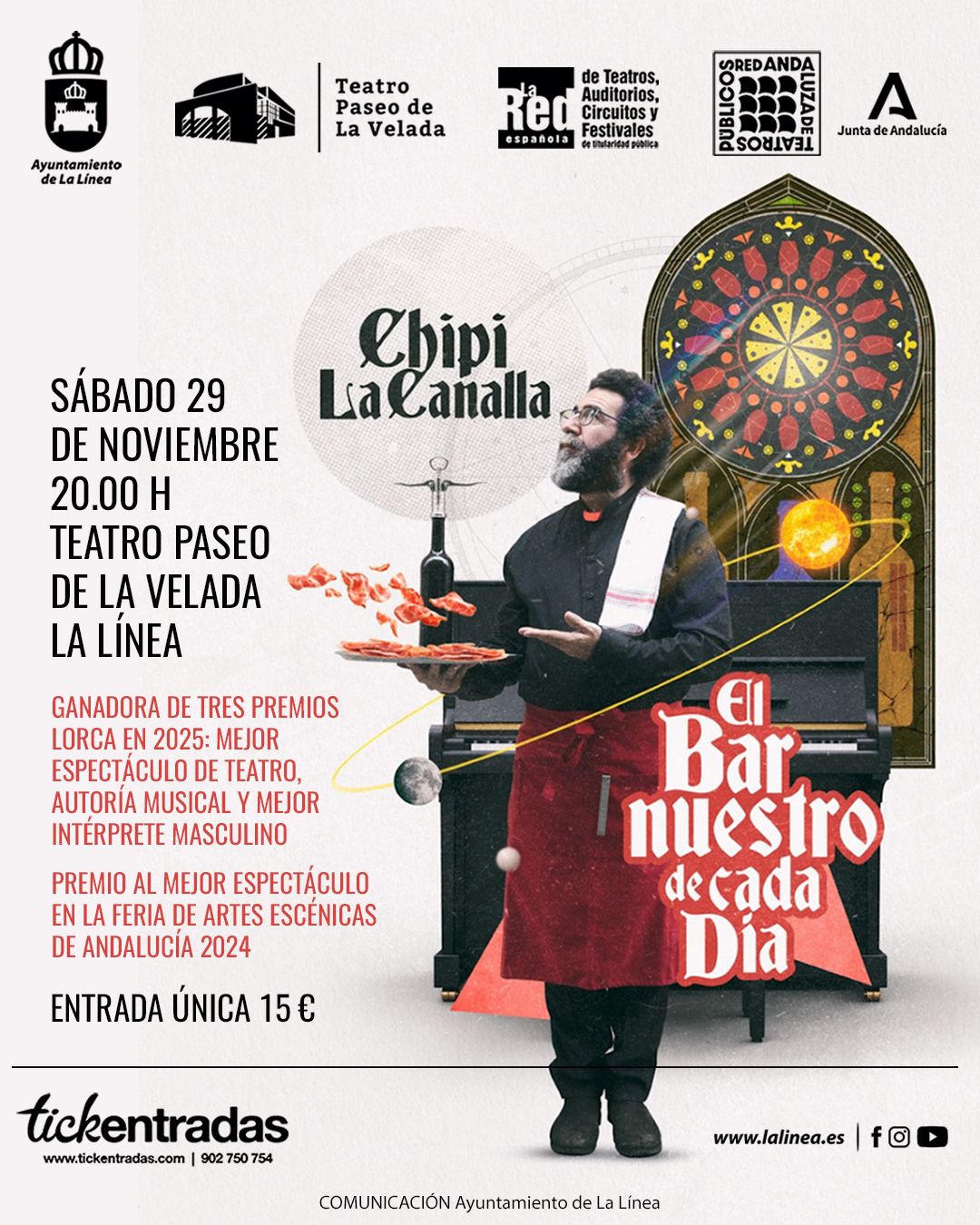 La Delegación de Cultura, en colaboración con la Agencia Andaluza de Instituciones Culturales (AAIICC), ha confirmado el último evento de su programación para el año 2025 en el Teatro Paseo de la Velada. Se trata de la obra ‘El Bar nuestro de cada Día’, de Chipi ‘La Canalla’, que se representará en una función extraordinaria el sábado 29 de noviembre.