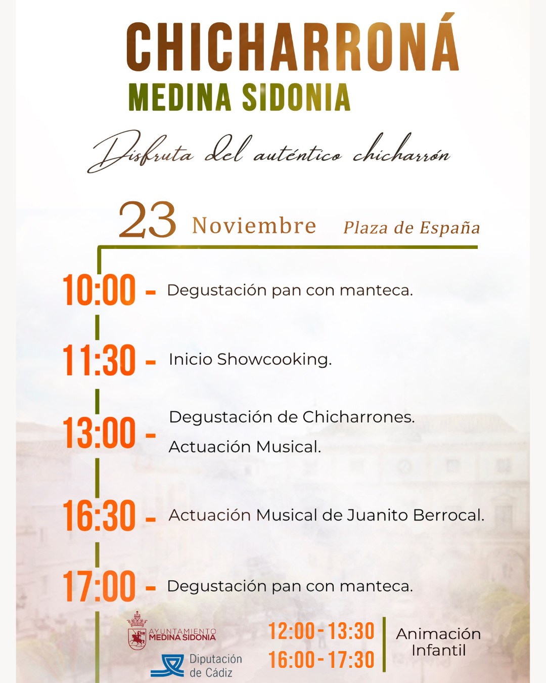 Debido a la previsión meteorológica prevista para este fin de semana, el Ayuntamiento de Medina Sidonia informa que la Chicharroná Asidonense se aplaza al próximo domingo 23 de noviembre, manteniendo el mismo horario y programación prevista.