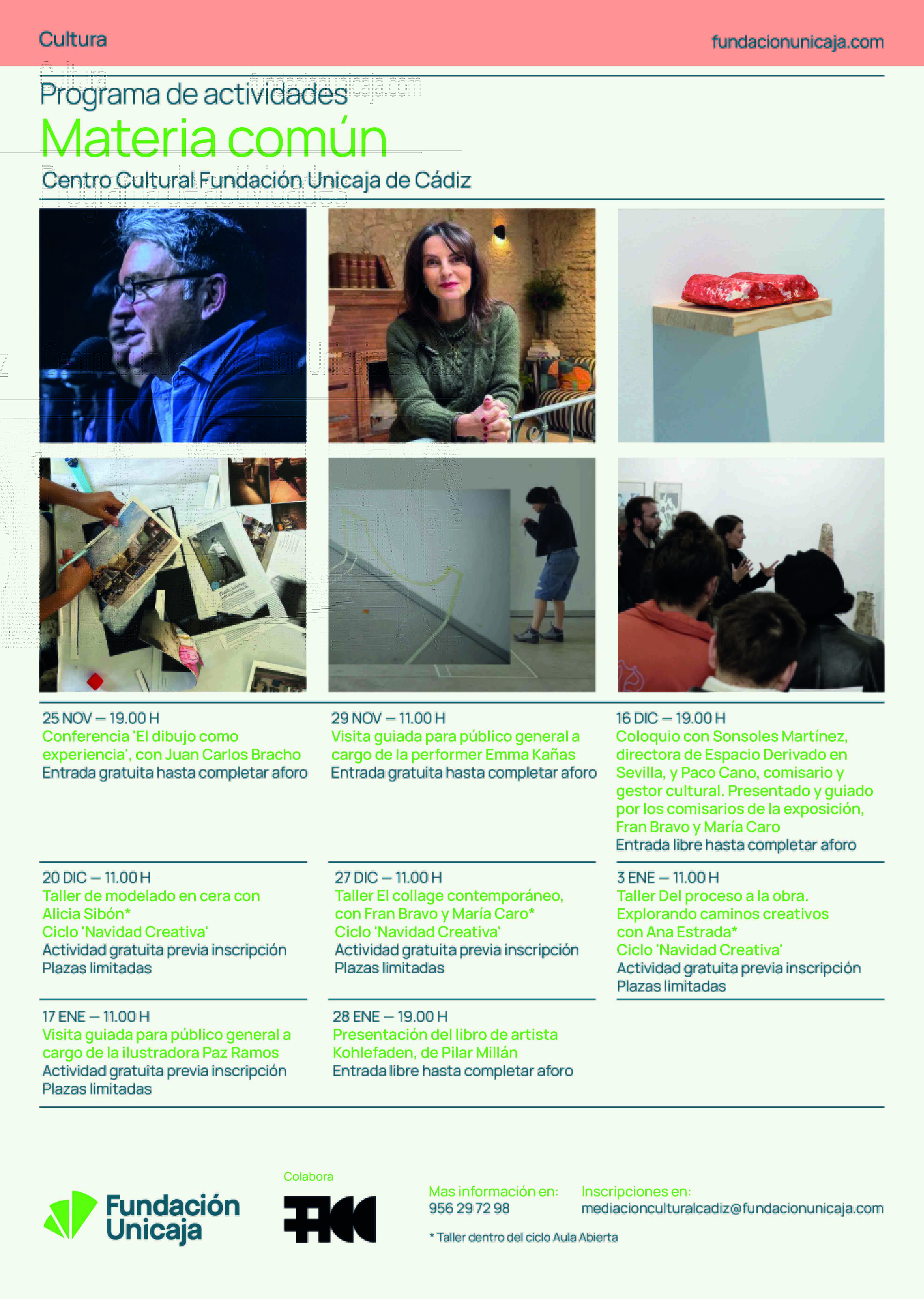 El sábado 20 de diciembre, a las 11:00 horas, tendrá lugar el taller ‘Modelado en Cera’ con Alicia Sibón; el sábado 27 de diciembre, a las 11:00 horas, se desarrollará el taller ‘El collage contemporáneo’; y el sábado 3 de enero, a las 11:00 horas, se celebrará el taller ‘Del proceso a la obra. Explorando caminos creativos con Ana Estrada’. Además, se ofrecerá una visita guiada el sábado 17 de enero, a las 11:00 horas. La programación culminará con la presentación del libro de artista Kohlefaden, de Pilar Millán, que tendrá lugar el 28 de enero a las 19.00 horas. Todas las actividades son gratuitas hasta completar aforo.