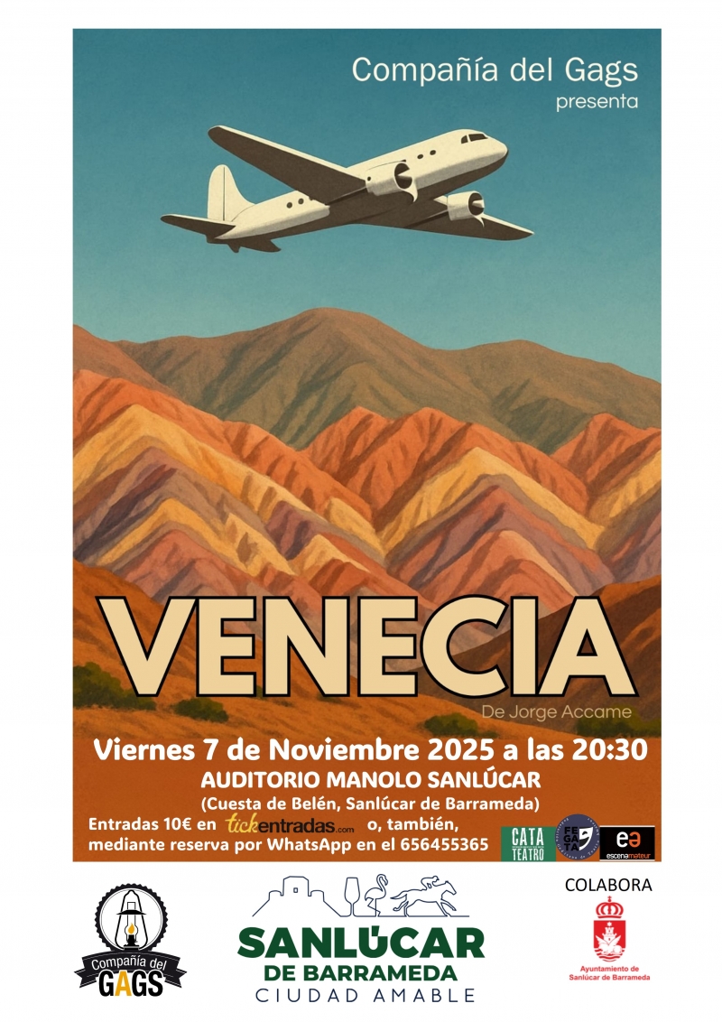 El Auditorio Municipal ‘Manolo Sanlúcar’ será el escenario donde la Compañía del Gags mostrará al público su nuevo montaje, que lleva por título Venecia, obra original del autor argentino Jorge Accame, bajo la dirección de Manuel Martín.
