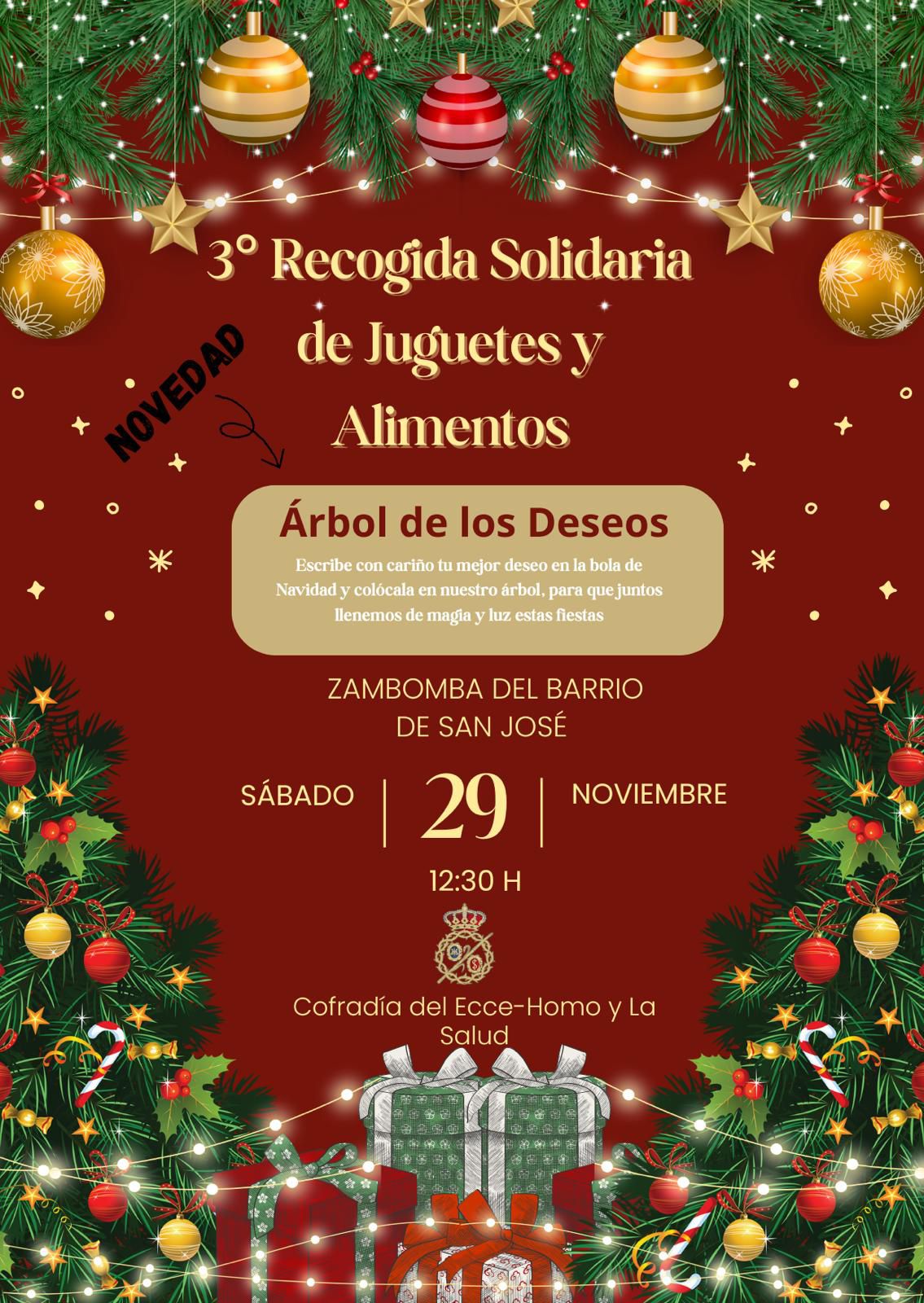Asimismo, en el patio de la Parroquia San José, tendrá lugar la recogida solidaria de alimentos y juguetes, a partir de las 12:30 horas, en la que participará el Paje Real, junto al Árbol de los Deseos, donde niños y mayores podrán escribir su deseo navideño en una bola y colgarla para llenar de ilusión estas fiestas.