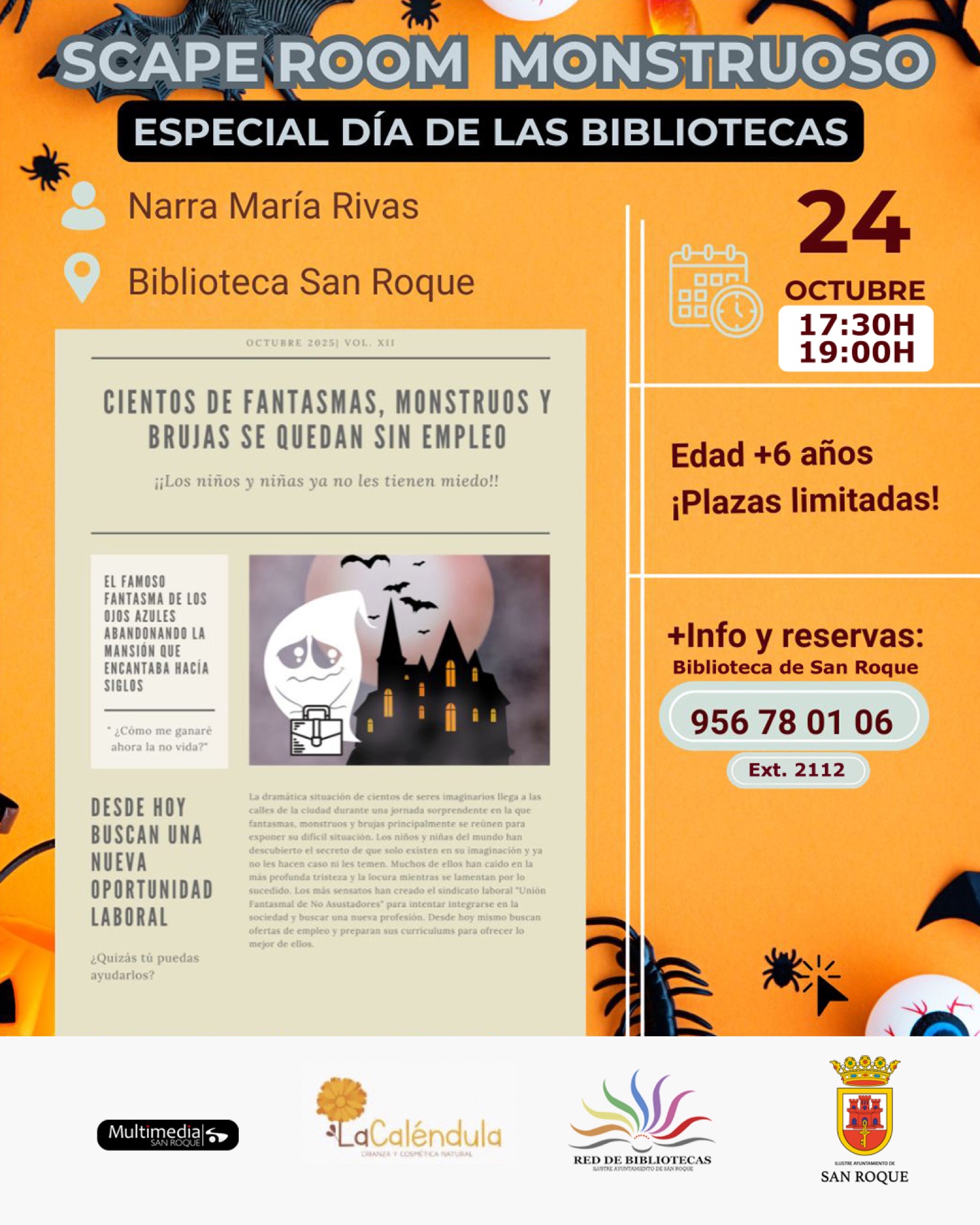 La Delegación de Bibliotecas del Ayuntamiento de San Roque, que dirige la concejal Rocío Fernández, quiere que el Día de las Bibliotecas 2025 sea muy especial. Para ello ha organizado este Scape Room Monstruoso, que se desarrollará el viernes 24 en sesión doble, a las 17.30 y a las 19.00 horas. La narradora María Rivas, de La Caléndula, será la encargada de conducir a los participantes, niños y niñas a partir de los 6 años, por las distintas pruebas preparadas.