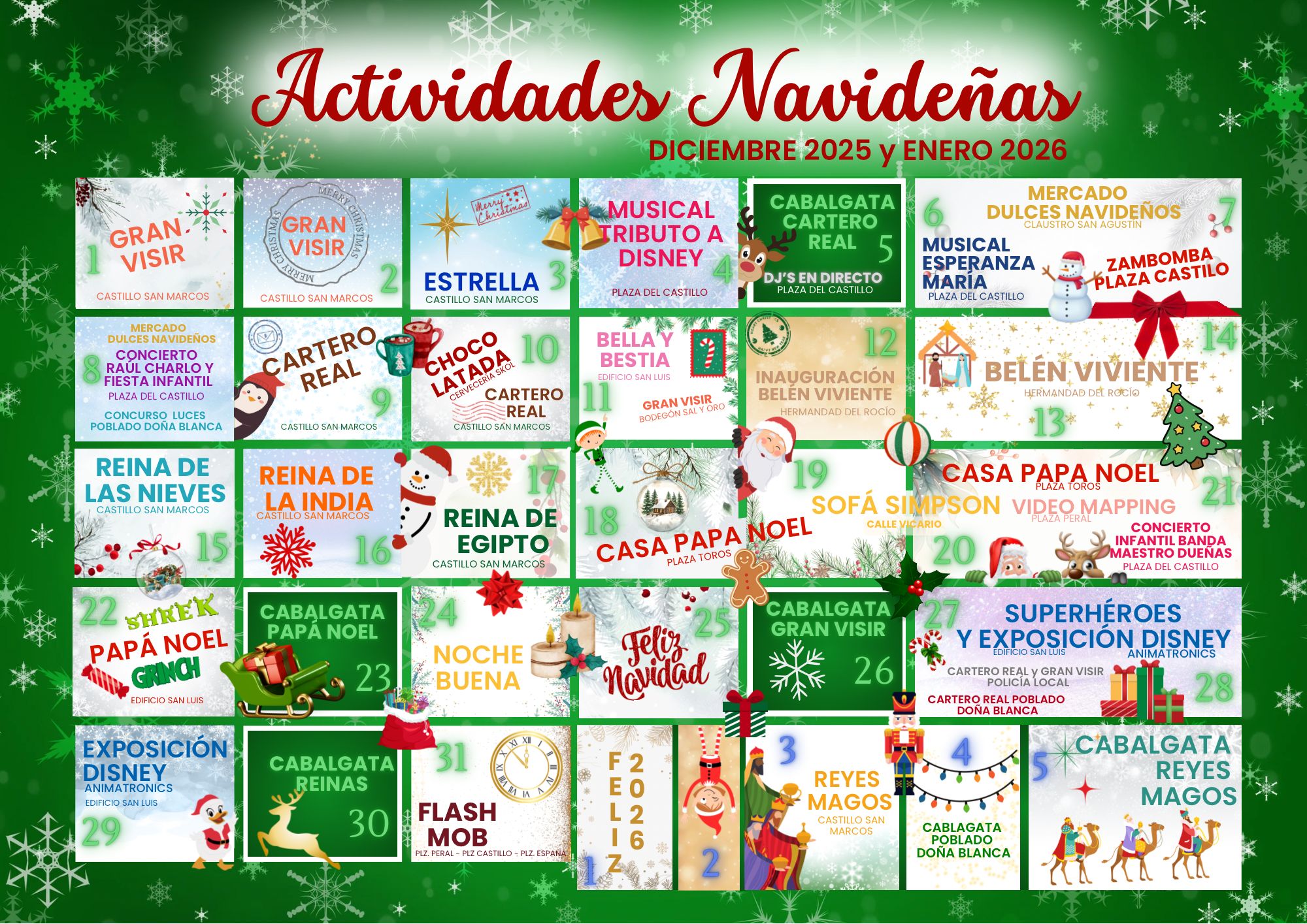 Calendario de actividades de la Campaña de Navidad 2025 bajo el lema “La Navidad de tus sueños está en El Puerto”.