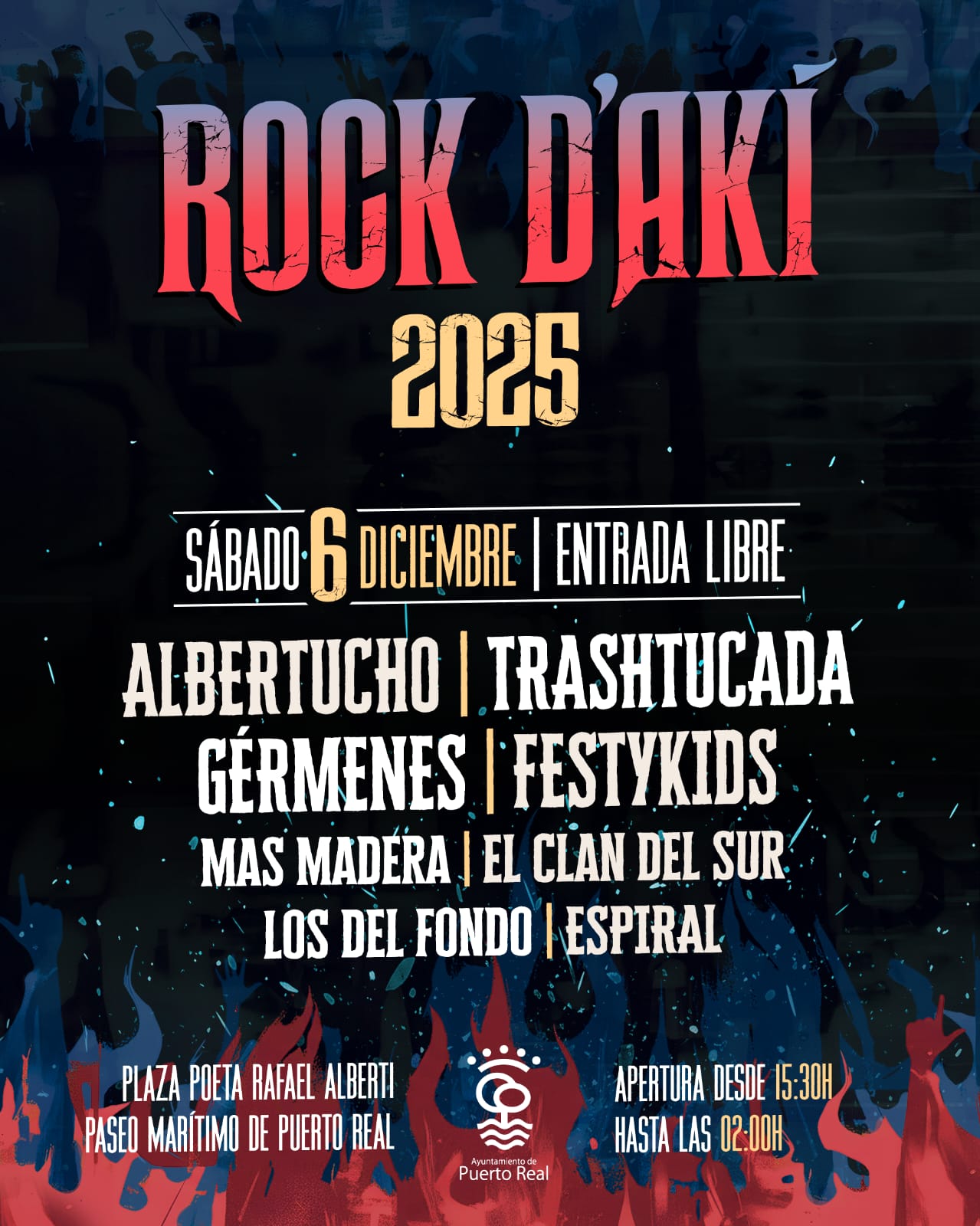 Rock D´Akí 2025 se celebra el sábado 6 de diciembre en la carpa instalada en la Plaza Poeta Rafael Alberti del Paseo Marítimo de Puerto Real, desde las 15:30 hasta las 2:00 horas, con un cartel integrado por ocho bandas y un enfoque centrado en la diversidad musical, la participación juvenil y la presencia de mujeres en escena.
