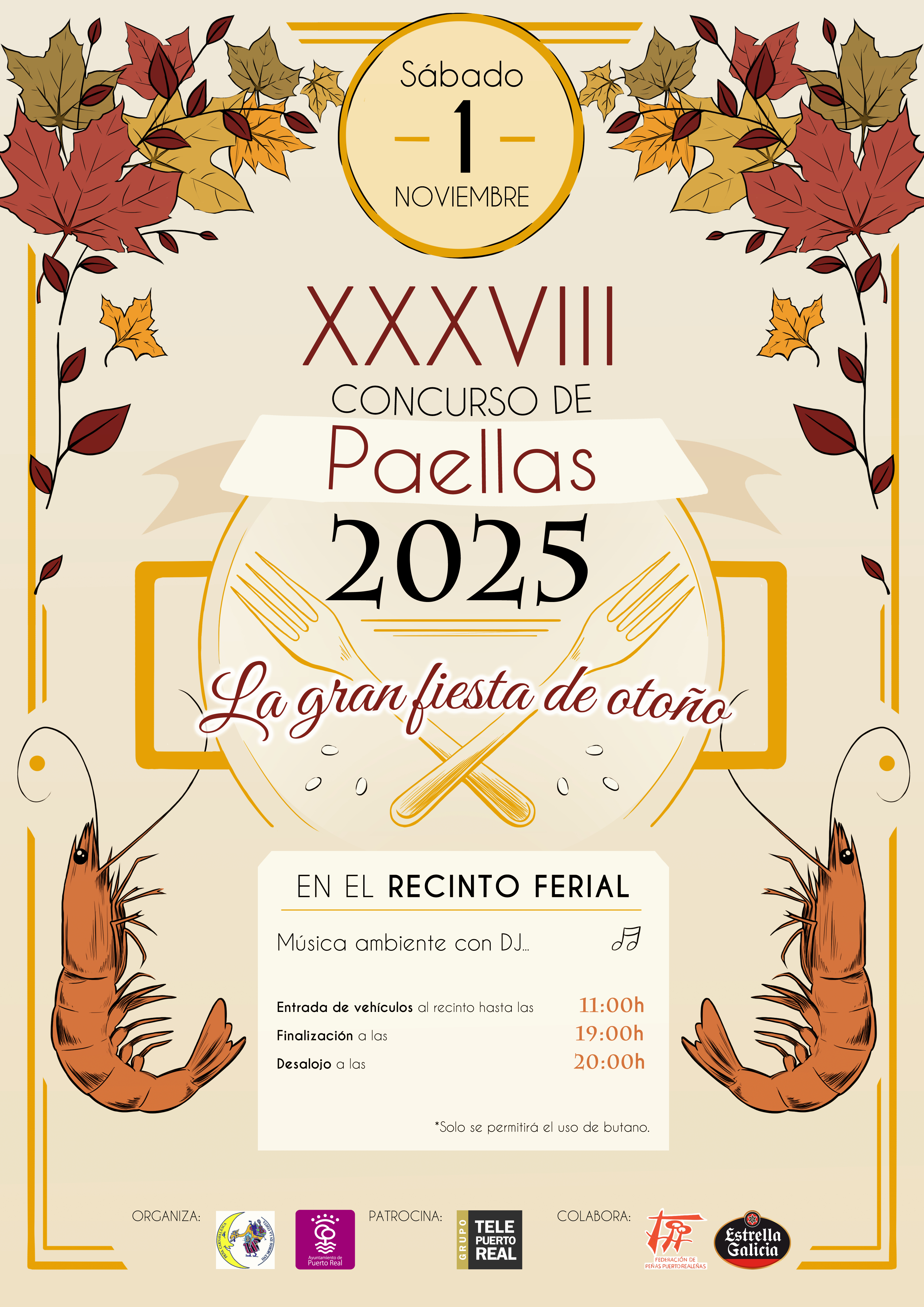 El sábado 1 de noviembre, el recinto ferial de Puerto Real volverá a llenarse de aromas, sabores y alegría con la celebración de la gran fiesta del otoño, el XXXVIII Concurso de Paellas, organizado por la Peña Hay Moros en la Costa conjuntamente con el Ayuntamiento, y patrocinado por Tele Puerto Real. El evento cuenta un año más con la colaboración de la Federación de Peñas Puertorrealeñas.