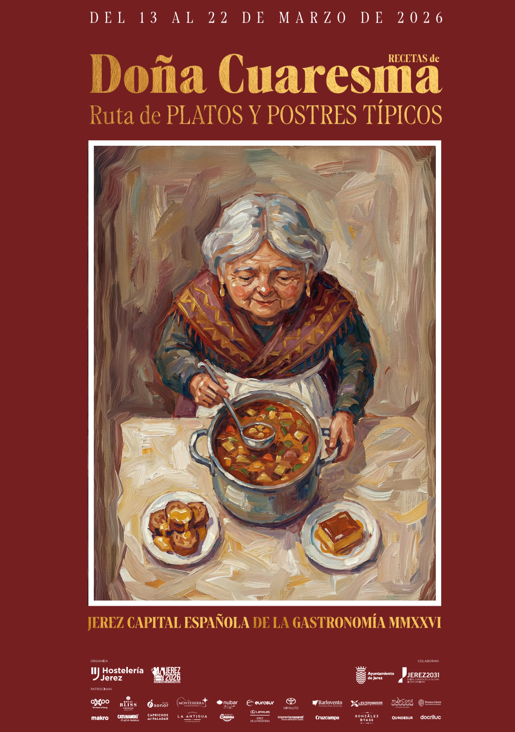 Organizadas por la pastelería " La Rosa de Oro" de Jerez. Este encuentro aspira a contribuir, en el marco de la Capitalidad Gastronómica 2026, a la difusión del patrimonio gastronómico dulce de Jerez, encontrando en el Alcázar un escenario histórico que dialoga de forma natural con la memoria y la tradición que se desea poner en valor.