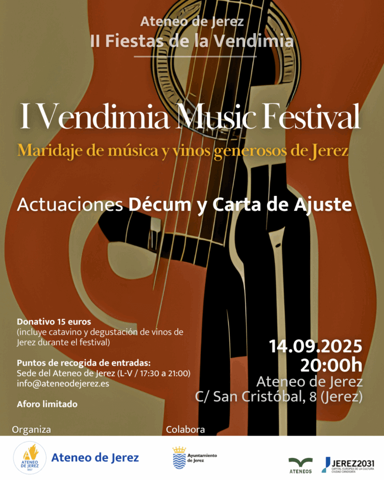Dentro de las II Fiestas de la Vendimia del Ateneo de Jerez que se celebran entre el 1 y 14 de septiembre coincidiendo con las Fiestas de la Vendimia de la ciudad, el Ateneo de Jerez ofrece el domingo 14 de septiembre el concierto “Vendimia Music Festival” como cierre de sus fiestas homenaje a la vendimia de los vinos generosos de Jerez. El festival musical comenzará a las c en la sede del Ateneo de Jerez, sito en la calle San Cristóbal número 8.