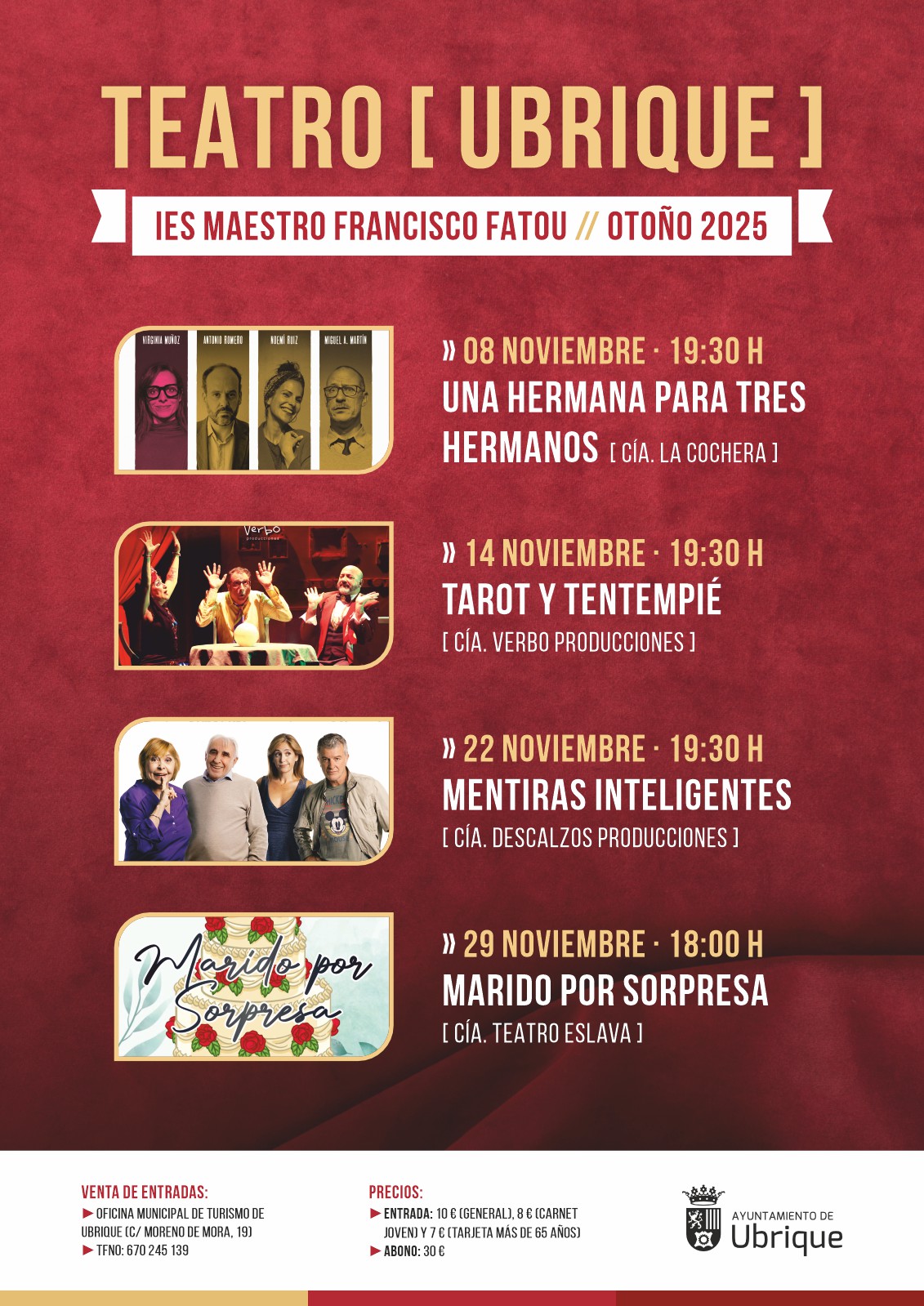 Durante el mes de noviembre se desarrollará en el Salón de Actos del IES Maestro Francisco Fatou la Campaña de Teatro de Ubrique - Otoño 2025 organizada por la Delegación de Cultura del Ayuntamiento de Ubrique.