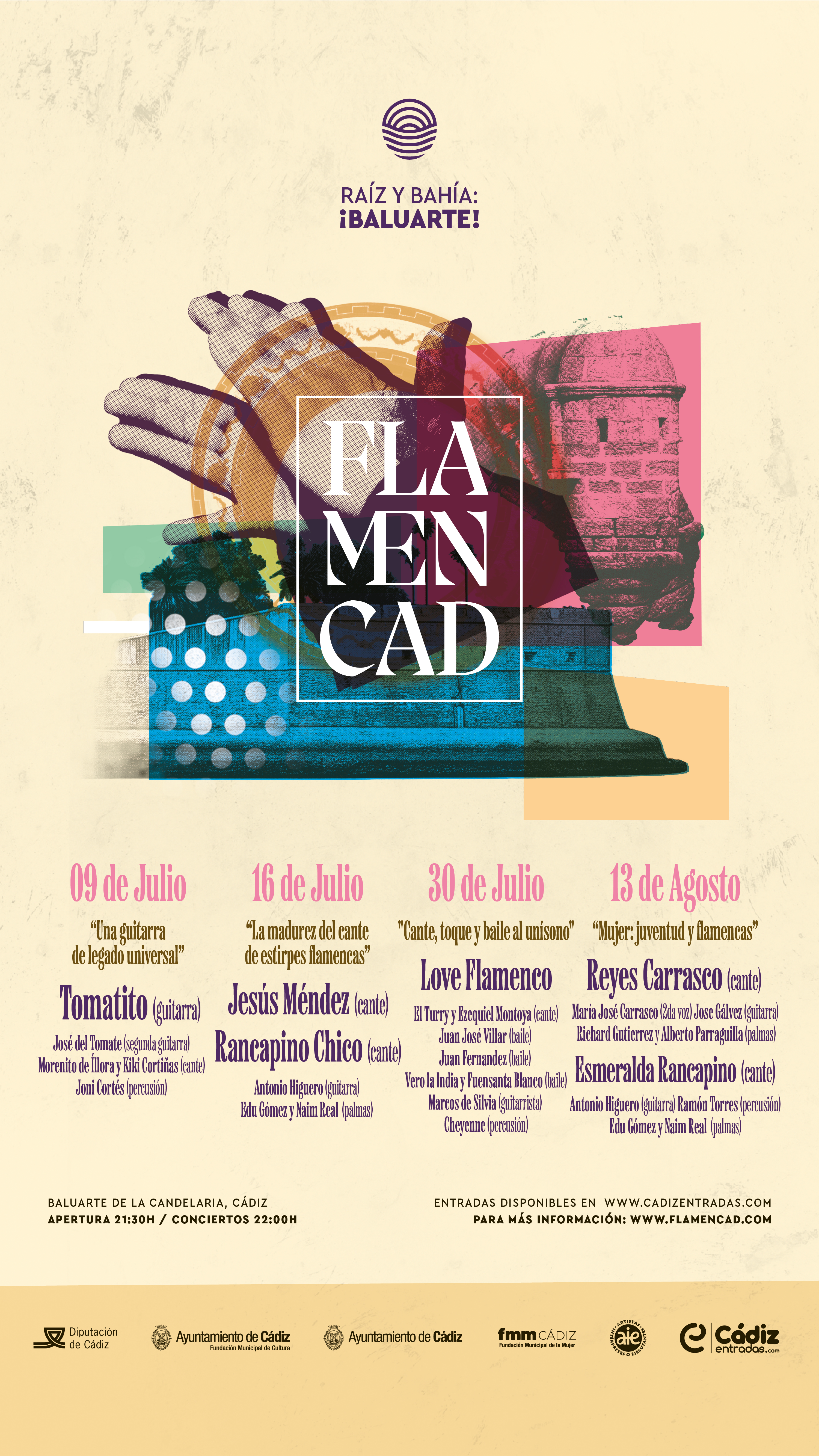 Entre los artistas participantes, estarán Tomatito, con el espectáculo ‘Una guitarra de legado universal’ (9 de julio), Jesús Méndez y Rancapino Chico con ‘La madurez del cante de estirpes flamencas’ (16 de julio) y el espectáculo ‘Love Flamenco’ (30 de julio), con Turry y Ezequiel Montoya al cante, el baile de Juan José Villar, Juan Fernández, Vero la India, y Fuensanta Blanco, y la guitarra de Marcos de Silvia y Cheyenne a la percusión. Como en las últimas ediciones, se ha apostado por dar visibilidad a la mujer, que protagonizará una noche propia, con la participación de Reyes Carrasco y Esmeralda Rancapino como protagonistas.