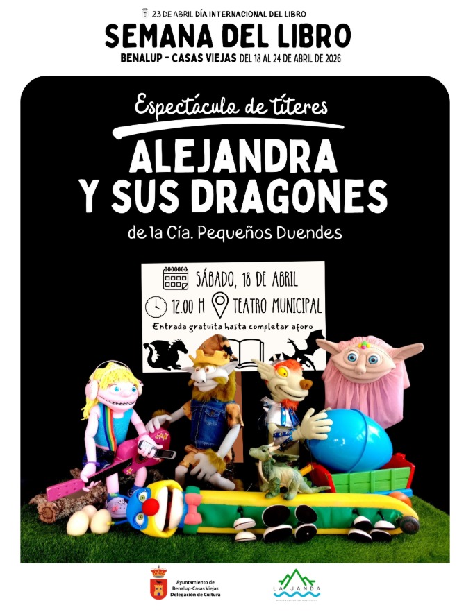 La Delegación de Cultura del Ayuntamiento de Benalup-Casas Viejas, dentro de los actos organizados con motivo del Día Internacional del Libro y junto con la colaboración de la Mancomunidad de la Janda, ha programado la representación del espectáculo de títeres ‘Alejandra y sus dragones’ para este sábado 18 de abril a las 12:00 horas en el Teatro Municipal. La entrada será gratuita hasta completar el aforo.