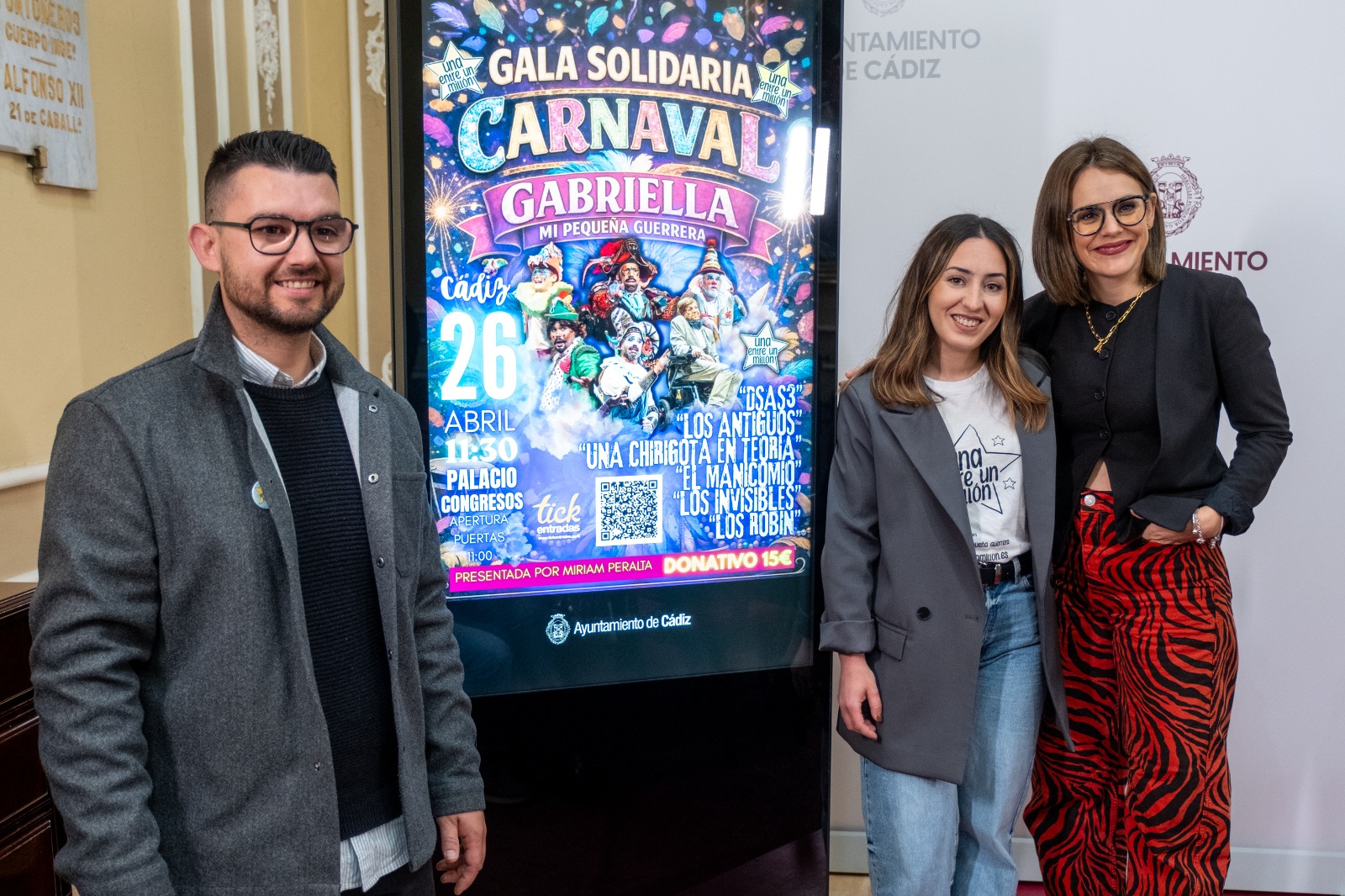 El Ayuntamiento de Cádiz ha acogido este miércoles el acto de presentación del cartel, que ha contado con la presencia de la teniente de alcalde de Fiestas y Carnaval, Beatriz Gandullo, y de Manuel Jarana García y María José Catena, portavoces de la Asociación 'Una entre un millón' y padres de Gabriella.