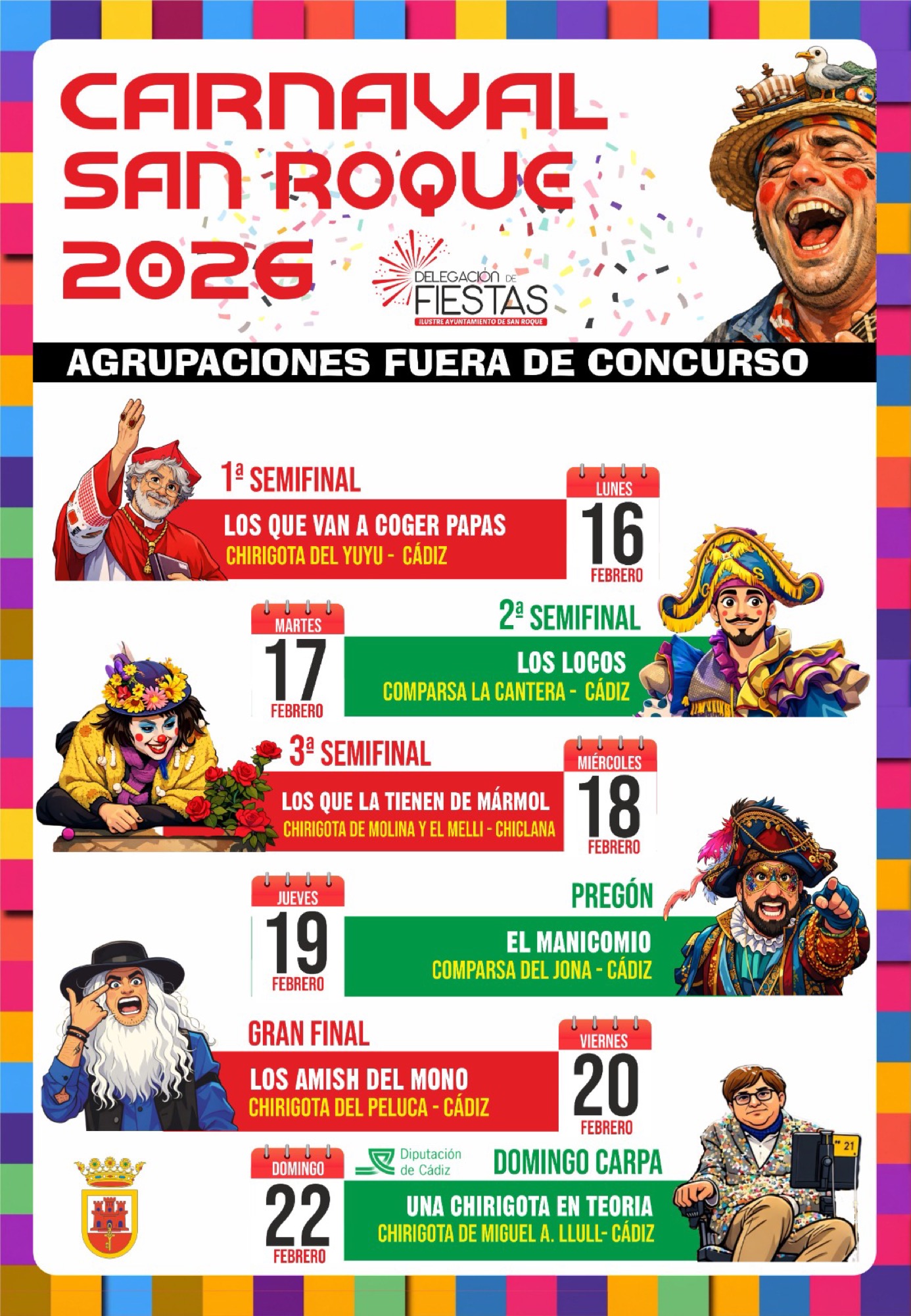 San Roque Ciudad y de Guadiaro, que contarán con sus respectivas cabalgatas y concursos de disfraces, así como fiestas infantiles y actuaciones de agrupaciones de carnaval. Además, el sábado 21 tendrá lugar la