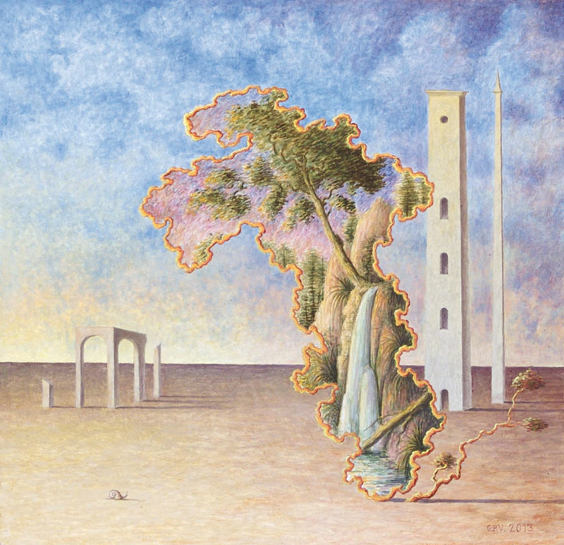Su obra a lo largo del tiempo se ha adentrado en diferentes temas y conceptos, pero se mantiene la presencia de algunos elementos, las construcciones, la mitología, la Biblia… la perspectiva, la geometría. Las huellas de sus paseos por la historia del arte, sus referencias a otros artistas, Morandi, De Chirico, Dalí… Y, siempre, la imaginación.