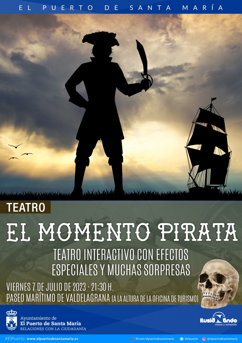 El viernes 7, a partir de las 21:30 horas, tendrá lugar en el Paseo Marítimo de Valdelagrana, a la altura de la Oficina de Turismo, en un escenario de casi metro y medio de altura sobre la arena, la representación teatral “El momento pirata”, una función de carácter gratuito apta para toda la familia, interactiva, con efectos especiales y muchas sorpresas que desde el Ayuntamiento se pone en marcha por vez primera.