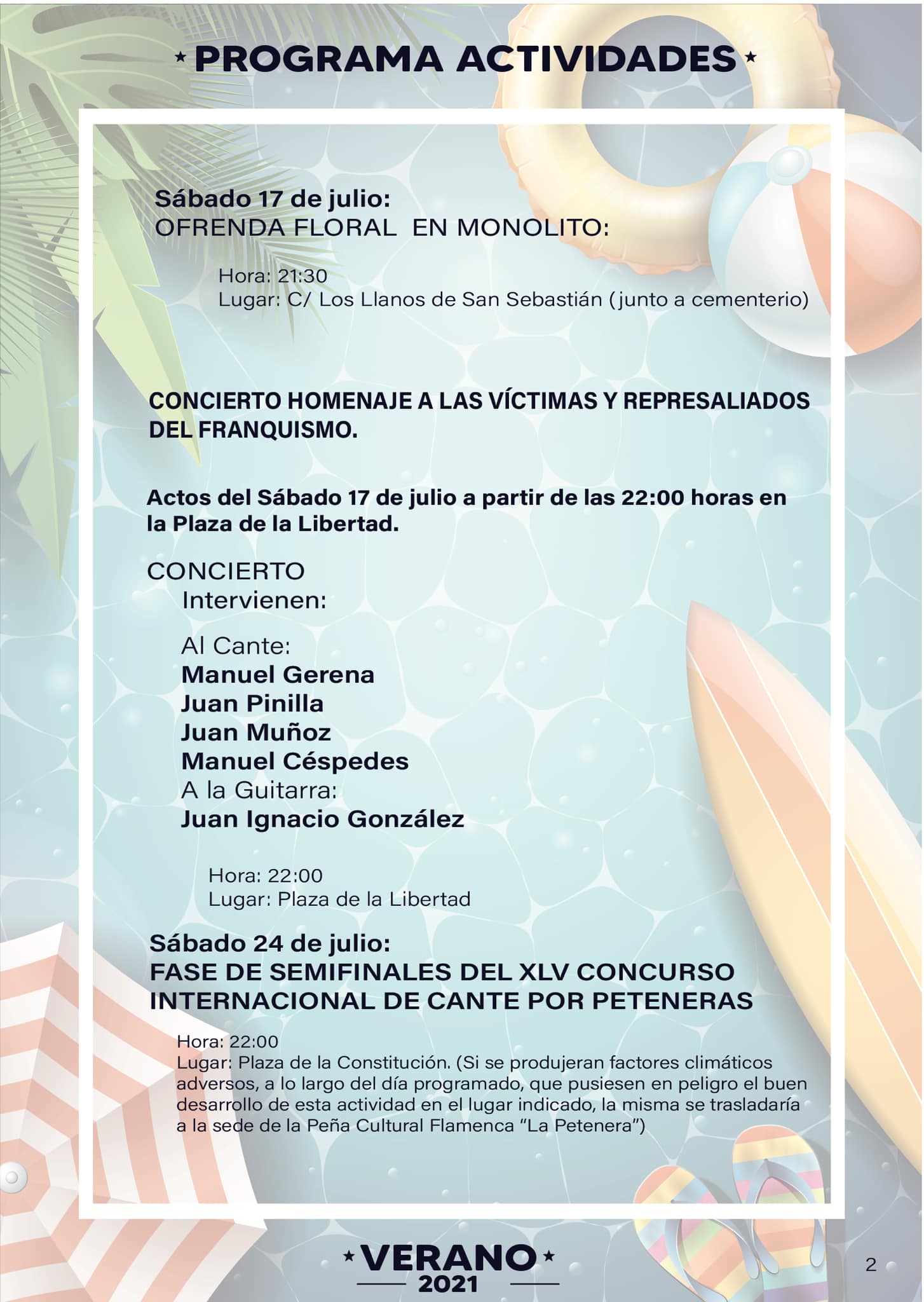 - Suspensión de todas las actividades pendientes de la Programación de Verano del 2021: cine de verano en familia, semana cultural de la Petenera, barbacoa municipal, actuaciones de los conciertos de pop-rock y la velada de septiembre.