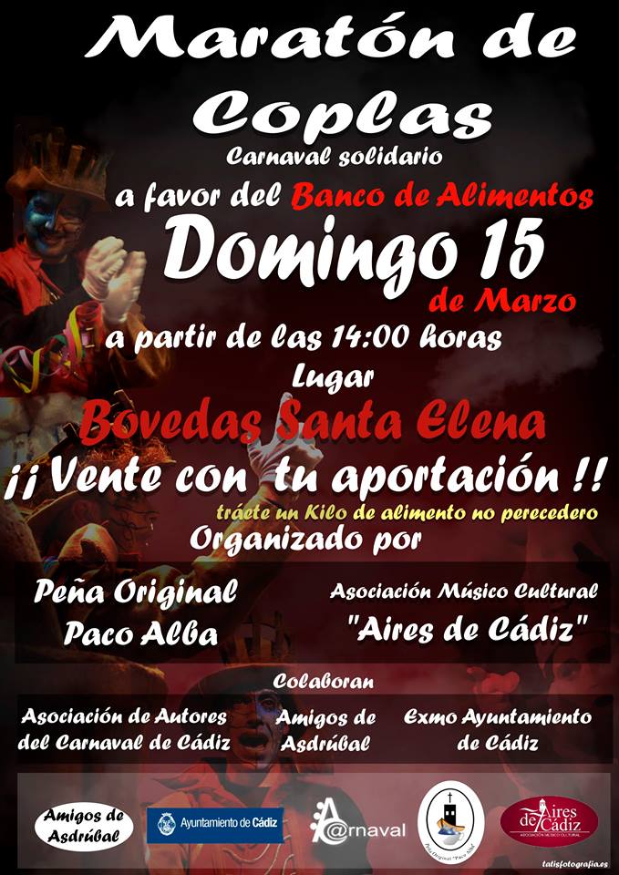 Varios proyectos de eventos solidarios se encuentran en periodo de gestación. El siguiente en confirmarse ya tiene fecha y será organizado por la peña original Paco Alba. La entidad del barrio de Santa María, con la colaboración de la Asociación Músico Cultural Aires de Cádiz y la Asociación de Autores de Carnaval, ha programado para el próximo domingo 15 de marzo el festival carnavalesco ‘Maratón de Coplas’ a beneficio del Banco de Alimentos.