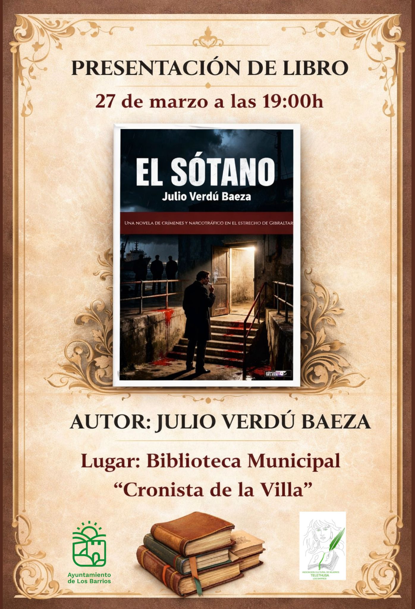 La biblioteca pública municipal ‘Cronista de la Villa acogerá esta semana la presentación de la última obra del autor Julio Verdú Baeza. Bajo el título “El Sótano”, esta novela de género negro sumerge al lector en las profundidades del crimen organizado en el Estrecho de Gibraltar. Esta cita literaria, organizada por la delegadación de Cultura, que dirige Cristina Marchante, con la colaboración de la Asociación Cultural de Mujeres ‘Telethusa’, tendrá lugar el próximo viernes, 27 de marzo, a las 19:00 horas.