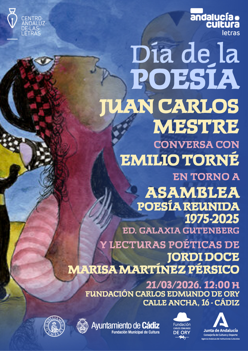 La Fundación Carlos Edmundo de Ory, en colaboración con el Centro Andaluz de las Letras y la Fundación Municipal de Cultura del Ayuntamiento de Cádiz, celebrará durante la semana del Día Mundial de la Poesía tres encuentros especiales. Las actividades tendrán lugar los días 17, 20 y 21 de marzo en el Espacio Cultural Ancha 16 y contarán con la participación de los poetas Javier Calderón Luna, María Alcantarilla, Marisa Martínez Pérsico, Jordi Doce y Juan Carlos Mestre, una de las voces más relevantes de la poesía española actual.