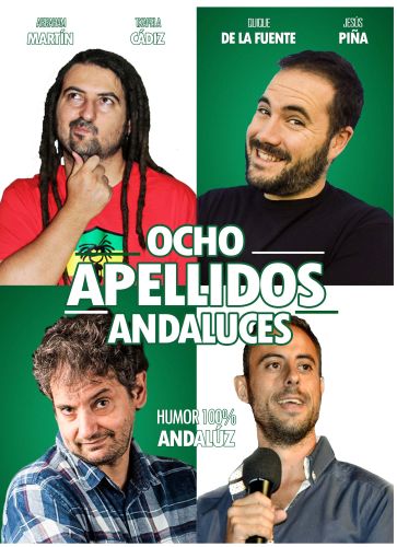 Los humoristas Quique de la Fuente, Txapela Cádiz, Abraham Martín y Jesús Piña, todos ellos cómicos andaluces, pero cada uno de madre y padre diferentes, se juntan para llenar de carcajadas los teatros y salas con su nuevo show de monólogos y chistes “Ocho Apellidos Andaluces” Un espectáculo con salero, cargado de ironía y mucha improvisación. Sin duda ¡Humor 100% andaluz!