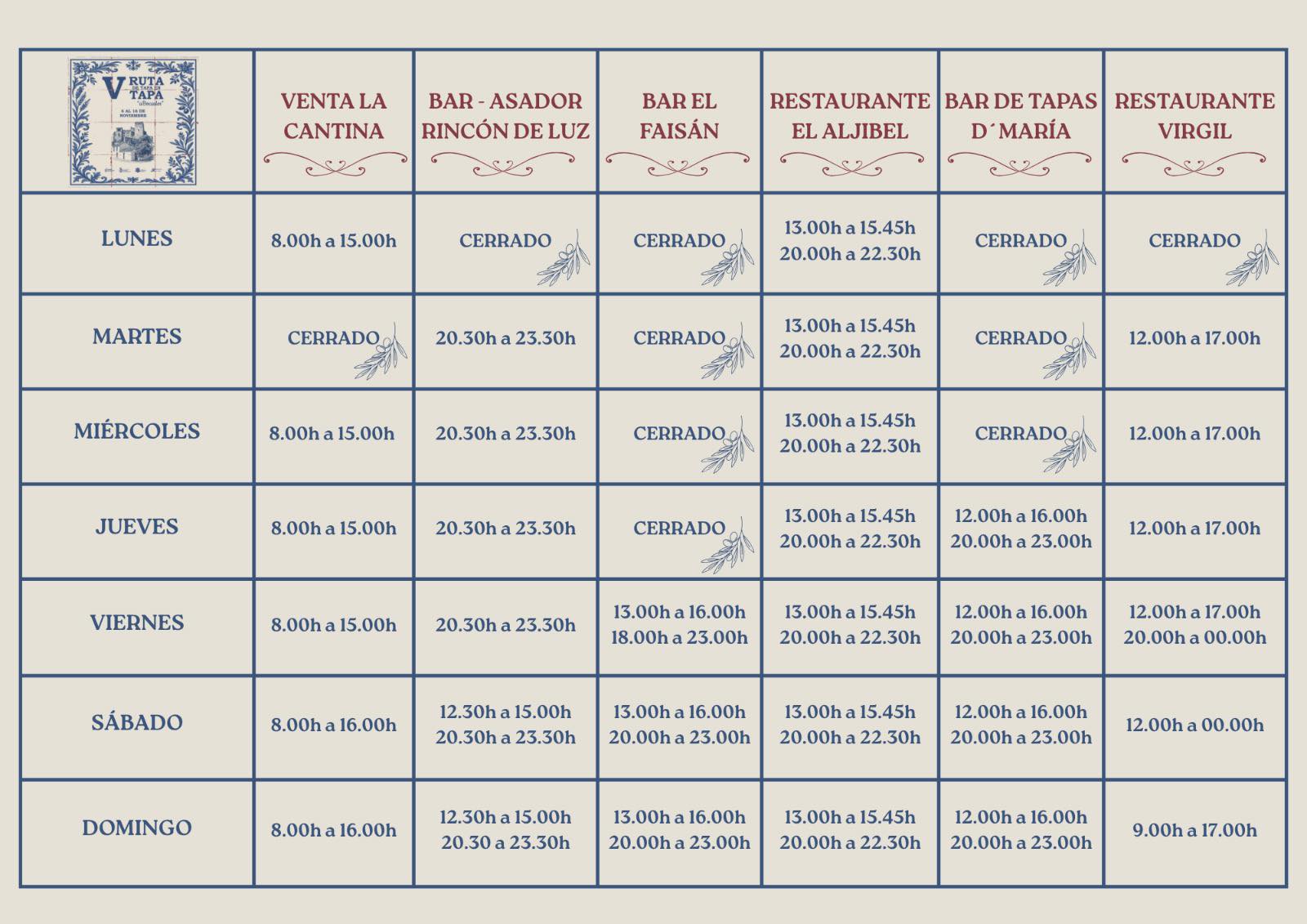 tapaporte en los establecimientos de la ruta. ¡Atento a los horarios! Las cocinas están a punto de empezar a trabajar.