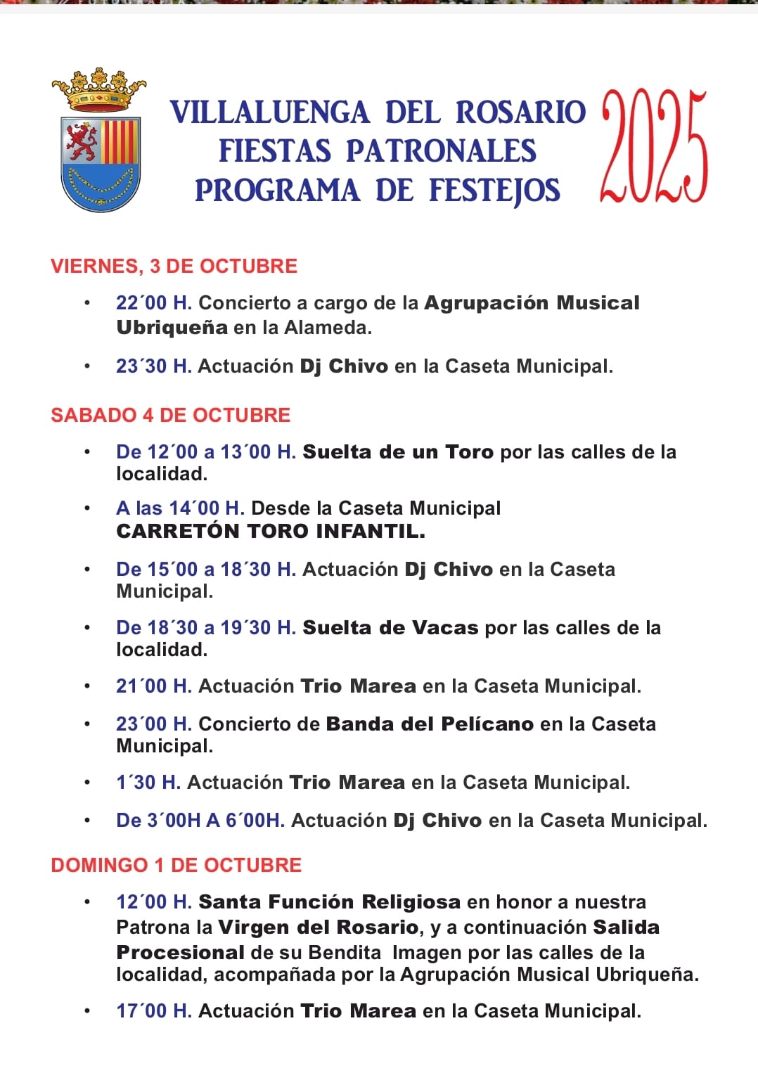 El programa dará comienzo el viernes 3 de octubre con el concierto de la Agrupación Musical Ubriqueña en la Alameda y la actuación de DJ Chivo en la Caseta Municipal. El sábado será una jornada intensa con la suelta extraordinaria de un toro enmaromado, el carretón infantil, la suelta de vacas y una noche de música con el Trío Marea, Concierto de la Banda del Pelícano y DJ Chivo. Finalmente, el domingo 5 de octubre se celebrará la Santa Función Religiosa en honor a la Virgen del Rosario y, a continuación, su procesión solemne por las calles de la localidad, para cerrar con la actuación del Trío Marea en la Caseta Municipal.
