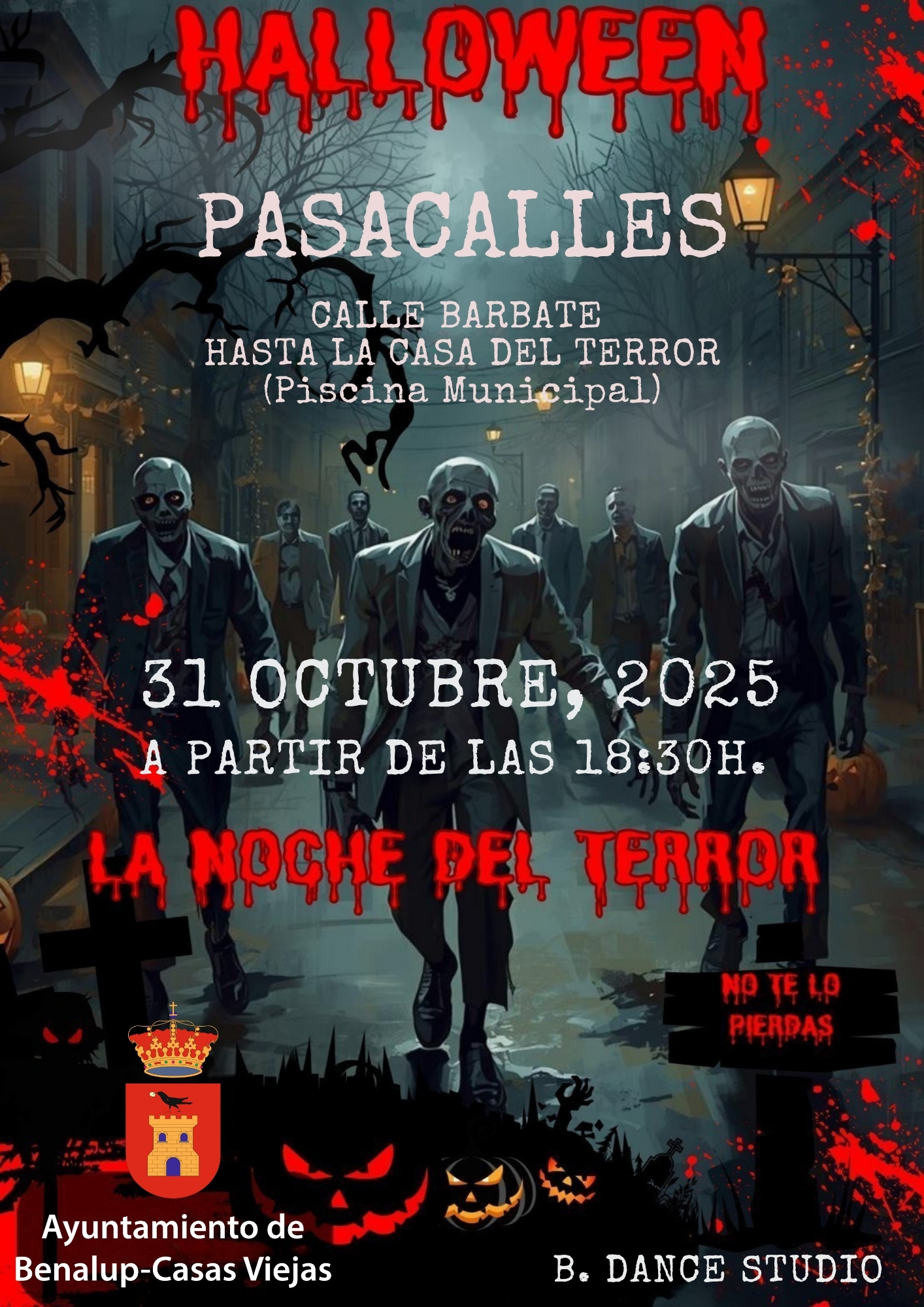 Las actividades previstas para Halloween arrancan con un pasacalles de los alumnos de B. Dance Studio a las 18:30 horas con salida en la calle Barbate en dirección al pasaje del terror, que estará instalado en la Piscina Municipal.