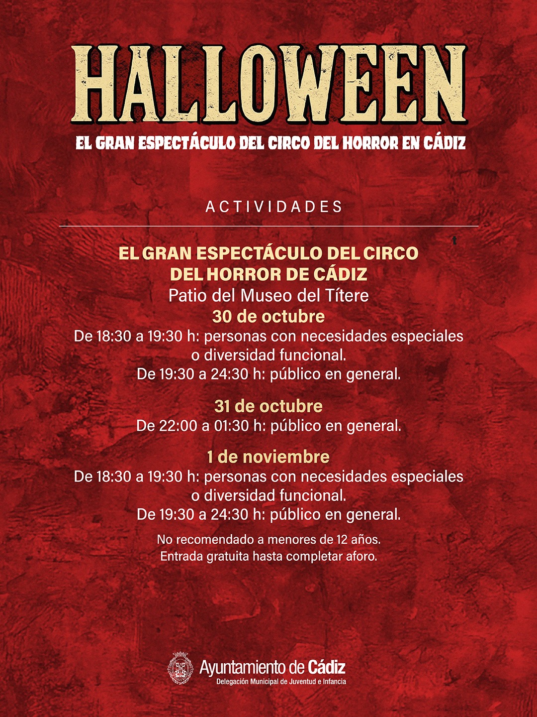 Este Halloween infantil traerá a Cádiz los días 30 y 31 de octubre y 1 de noviembre, el gran espectáculo ‘La Plazuela del Truco o Trato’, en el que los más pequeños podrán disfrutar en el patio de la Casa del Niño Jesús de 17:00 a 22:00 horas, con entrada gratuita hasta completar aforo.