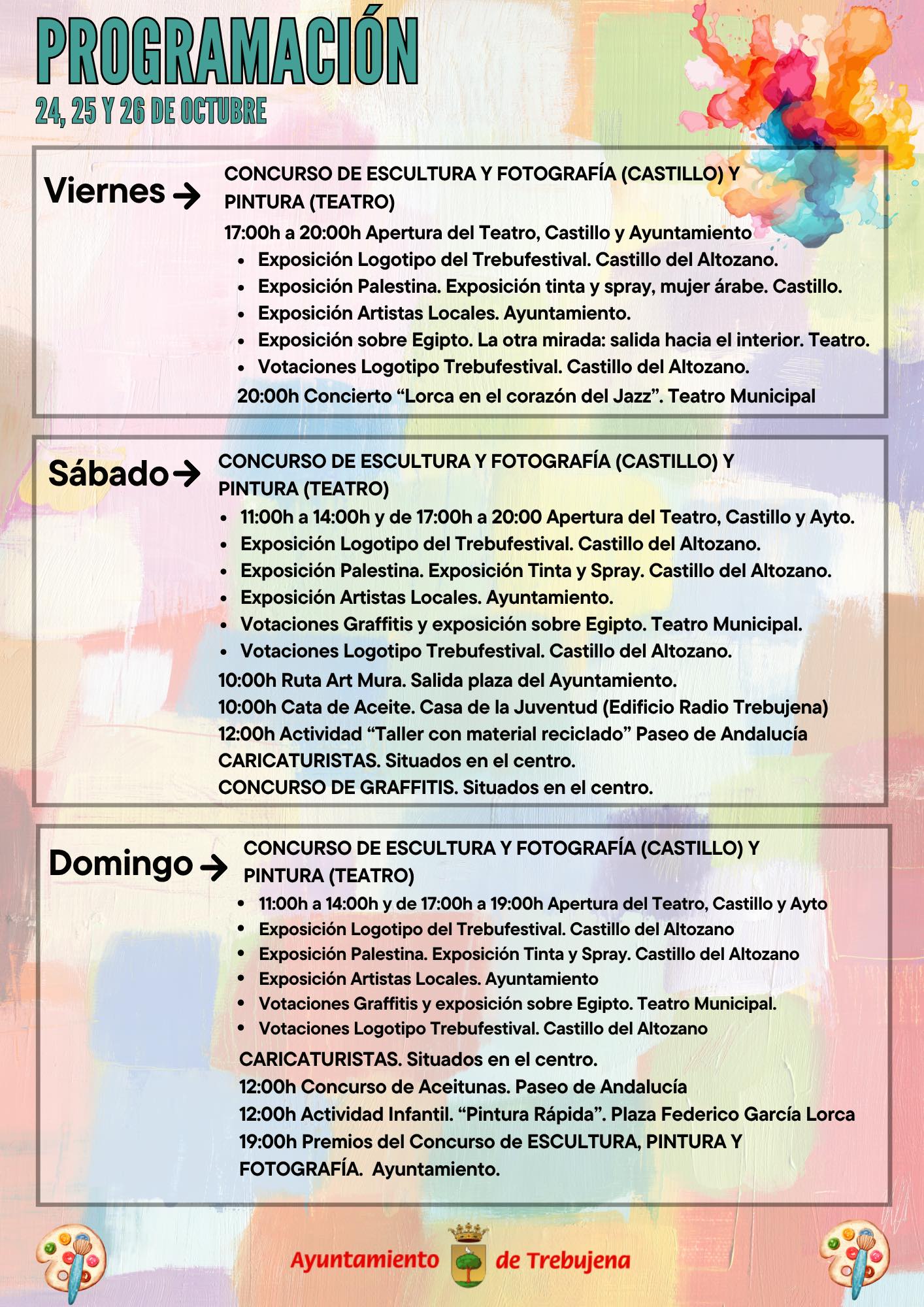 Durante los tres días, el Teatro Municipal, el Castillo del Altozano y el Ayuntamiento acogerán el Concurso de Escultura, Pintura y Fotografía, junto con las exposiciones de artistas locales y sobre Palestina y la exposición del Concurso del Logotipo del Trebufestival. Todas estas propuestas podrán visitarse durante las tres jornadas.