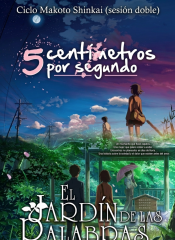 dirigida por: Makoto Shinkai reparto: Animación Una sesión doble que reúne dos de las obras más delicadas y representativas del cine de Makoto Shinkai. En 5 centimetros por segundo, el director construye un emotivo relato sobre el paso del tiempo y la distancia entre dos personas que intentan mantener vivo su vínculo a lo largo de los años. A través de tres episodios, la película retrata cómo los sentimientos cambian mientras la vida avanza, con la característica sensibilidad visual de Shinkai. La sesión continúa con El jardín de las palabras, una breve y poética historia ambientada en un jardín de Tokio durante los días de lluvia. Allí se encuentran un estudiante que sueña con diseñar zapatos y una mujer que parece esconder sus propios problemas, iniciando una relación marcada por la complicidad, el silencio y la belleza de los pequeños momentos. Dos historias íntimas sobre encuentros, emociones y la fragilidad de las relaciones, que muestran el lado más lírico y emocional de uno de los grandes autores del anime contemporáneo. |